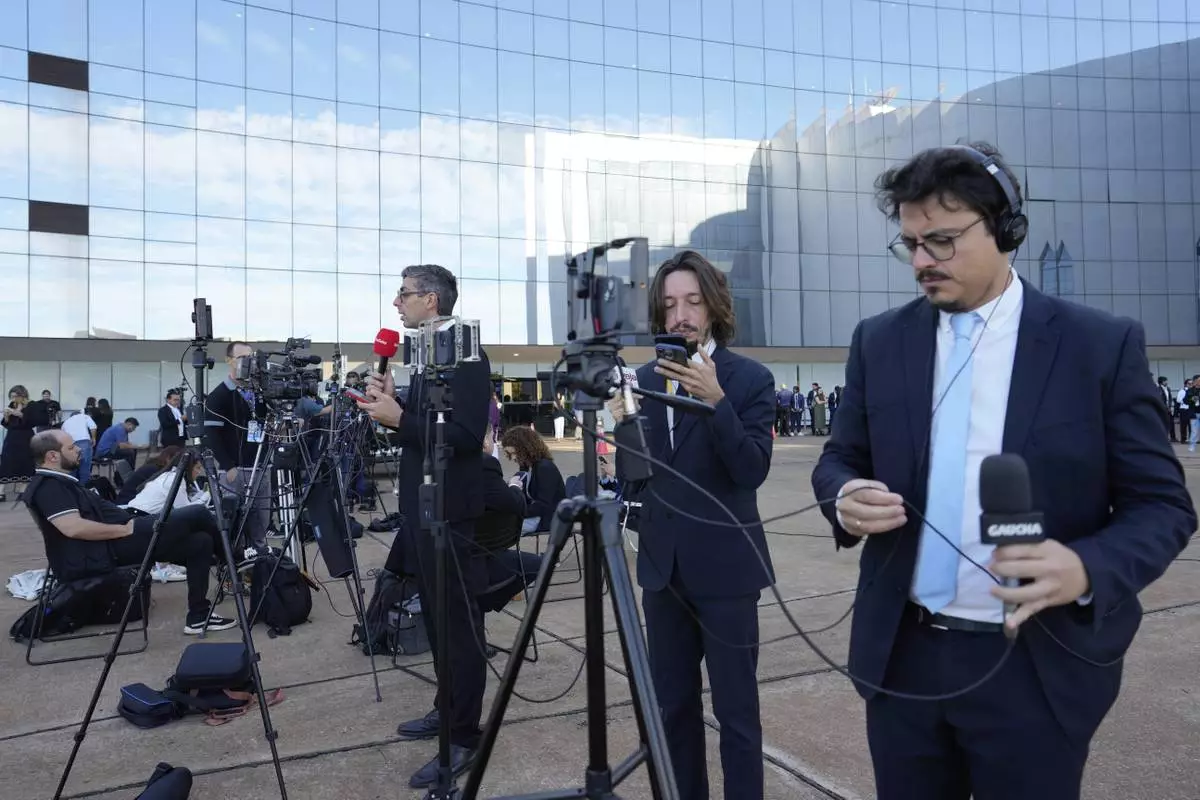 Journalists work outside the Supreme Court prior to the verdict and sentencing phase of a trial for those charged in an alleged coup plot to keep Brazil's former President Jair Bolsonaro in office after his 2022 election defeat, in Brasilia, Brazil, Tuesday, Sept. 2, 2025. (AP Photo/Eraldo Peres)