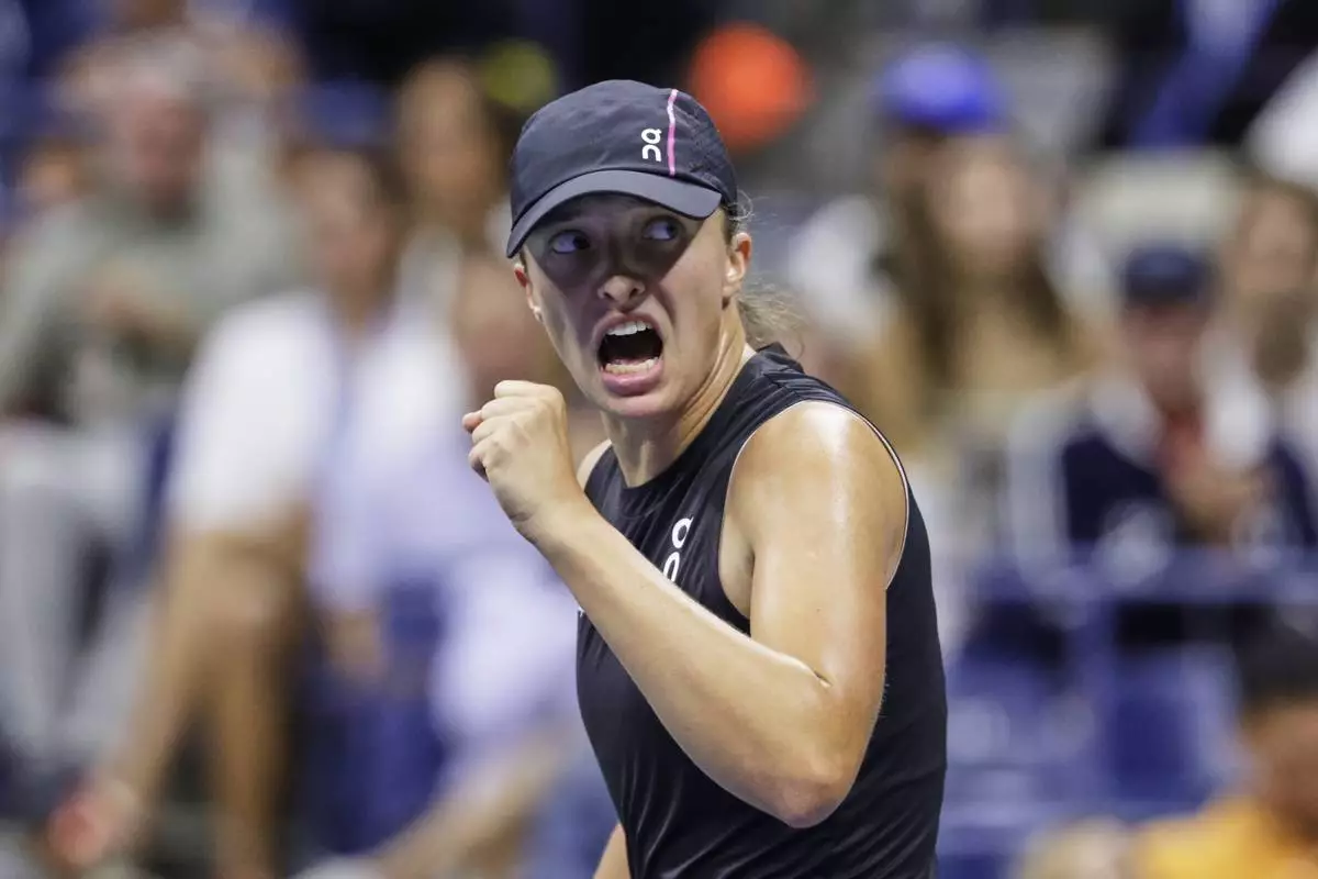 Iga Swiatek, of Poland, reacts after winning a game against Anna Kalinskaya, of Russia, during the third round of the U.S. Open tennis championships, Saturday, Aug. 30, 2025, in New York. (AP Photo/Adam Hunger)