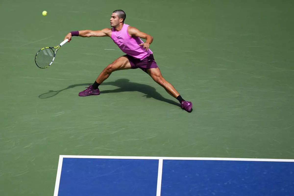 Carlos Alcaraz, of Spain, returns a shot to Luciano Darderi, of Italy, during the third round of the U.S. Open tennis championships, Friday, Aug. 29, 2025, in New York. (AP Photo/Yuki Iwamura)