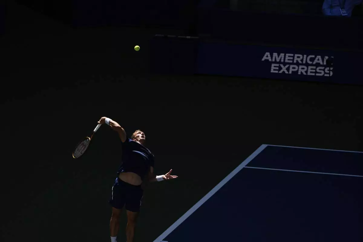 Leandro Riedi, of Switzerland, serves against Alex de Minaur, of Australia, during the fourth round of the US Open tennis championships, Monday, Sept. 1, 2025, in New York. (AP Photo/Heather Khalifa)