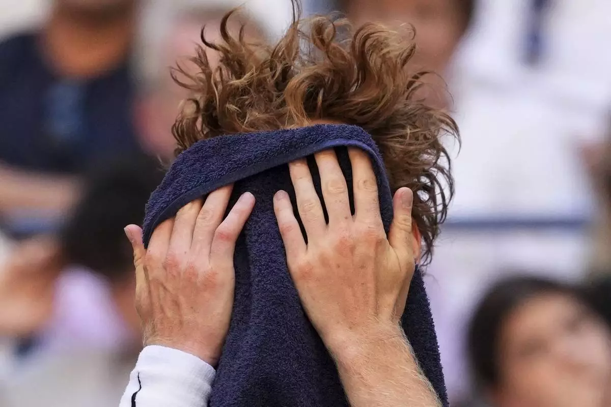 Jannik Sinner, of Italy, dries his face during a breat in the third round of the U.S. Open tennis championships, Saturday, Aug. 30, 2025, in New York. (AP Photo/Kirsty Wigglesworth)