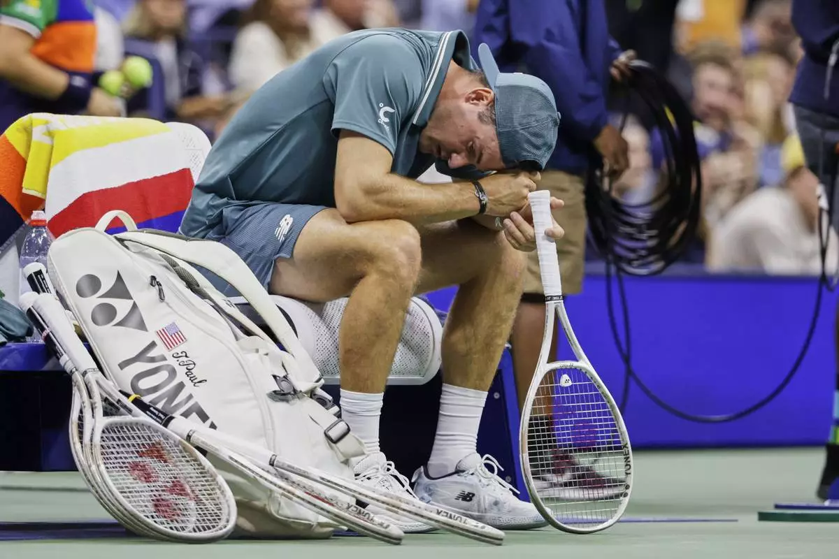 Tommy Paul, of the United States, reacts after losing the third set against Alexander Bublik, of Kazakhstan, during the third round of the U.S. Open tennis championships, Saturday, Aug. 30, 2025, in New York. (AP Photo/Adam Hunger)