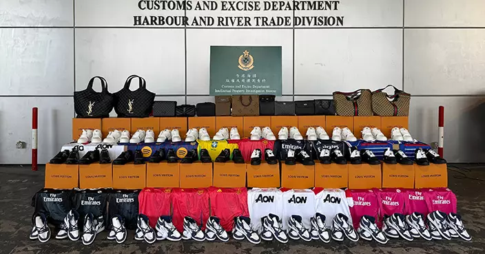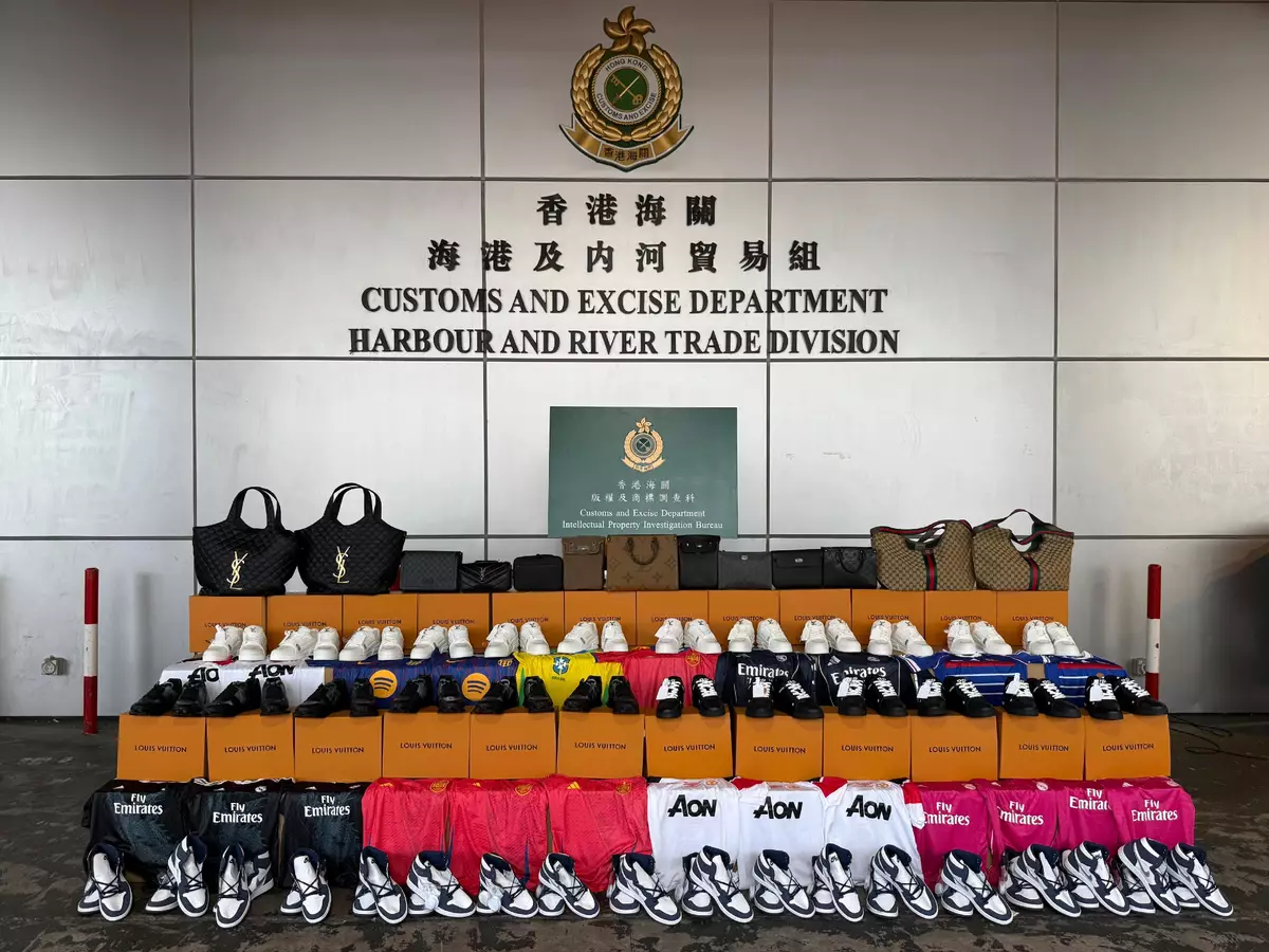 Hong Kong Customs on August 13 seized about 7 700 suspected counterfeit goods, including sneakers, bags and jerseys, with an estimated market value of about $1.27 million at the Tuen Mun River Trade Terminal Customs Cargo Examination Compound.