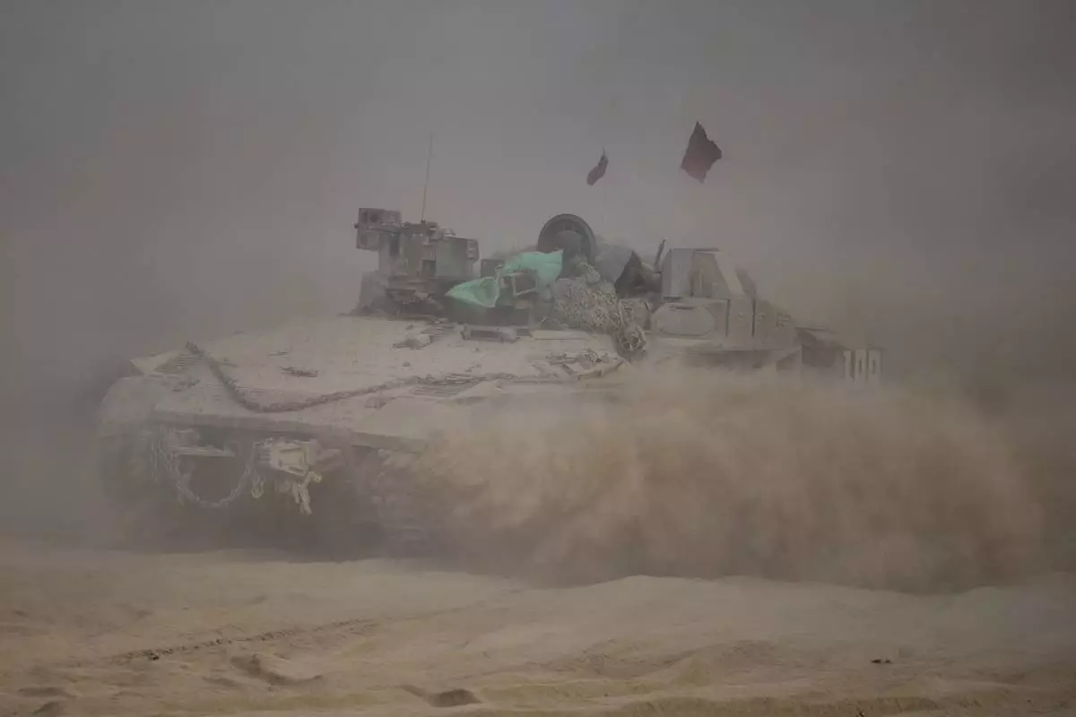 Israeli soldiers move on armored personnel carriers (APC) near the Israeli-Gaza border, in southern Israel, Tuesday, Sept. 2, 2025. (AP Photo/Ohad Zwigenberg)