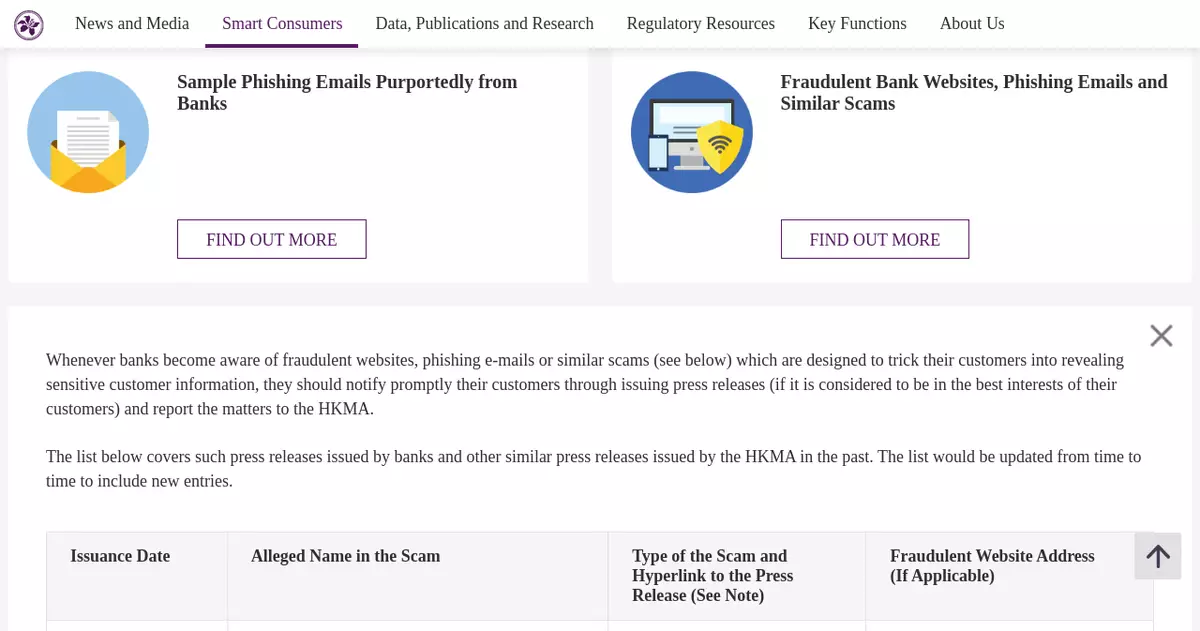 The Hong Kong Monetary Authority (HKMA) wishes to alert members of the public to the press releases issued by the banks listed below relating to fraudulent websites, internet banking login screens, phishing emails or other scams, which have been reported to the HKMA. Hyperlinks to the press releases are available on theHKMA website.