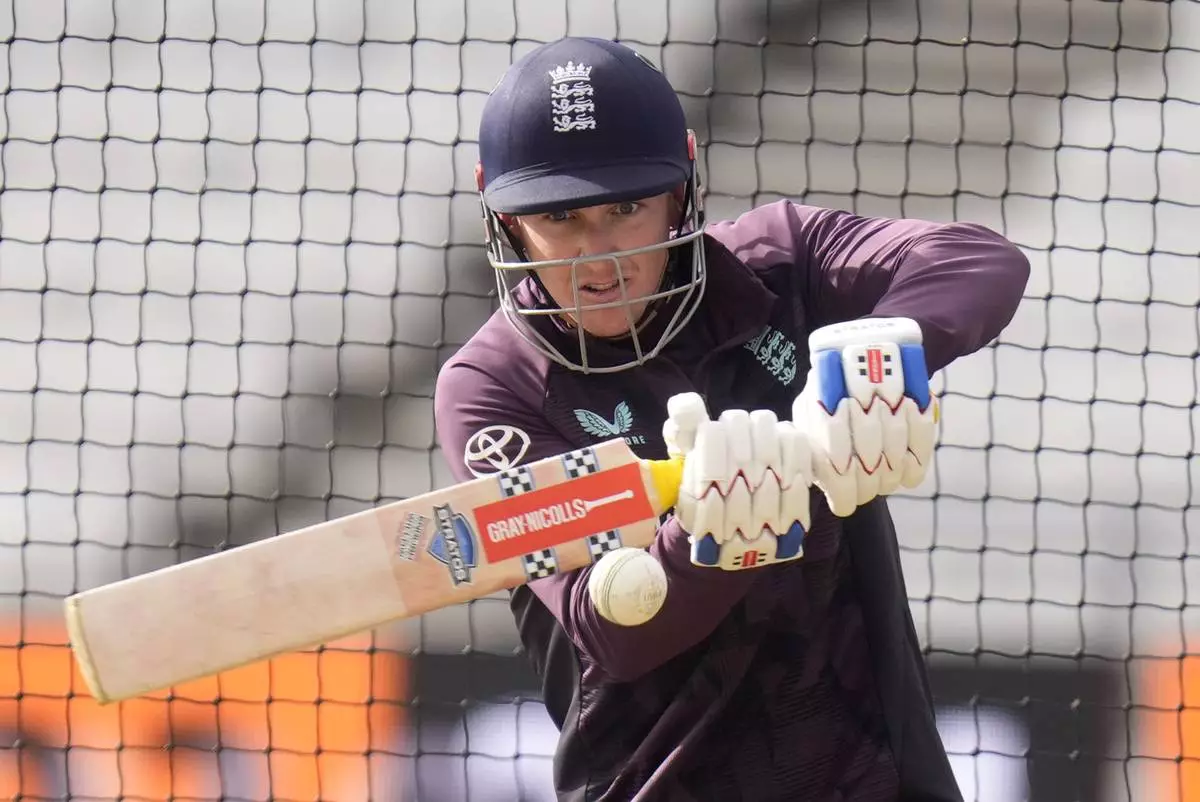 England's Harry Brook practices during a nets session at Headingley, Leeds, England, Monday Sept. 1, 2025. (Danny Lawson/PA via AP)