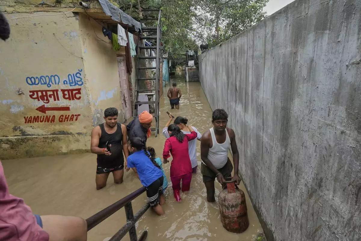 Residents wade through floodwater after the river Yamuna, swollen by incessant rain in the higher regions, overran its banks, in New Delhi, India, Tuesday, Sept. 2, 2025. (AP Photo/Manish Swarup)