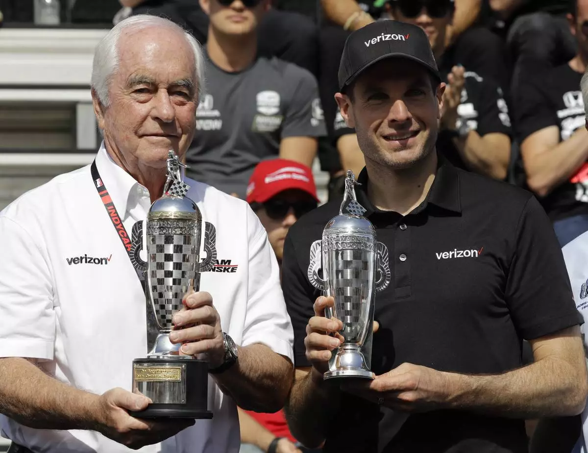 FILE - Car owner Roger Penske, left, and driver Will Power, of Australia, receive their "Baby Borg" trophies for winning last years race during the drivers meeting for the Indianapolis 500 IndyCar auto race at Indianapolis Motor Speedway, Saturday, May 25, 2019, in Indianapolis. (AP Photo/Darron Cummings, file)