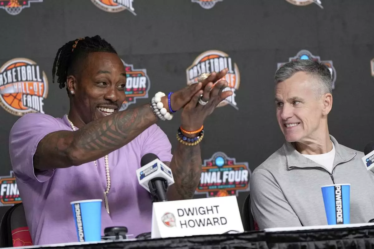 FILE - Dwight Howard, left, shows his support for the Florida Gators as Billy Donovan, right, watches during a Naismith Hall Fame Class of 2025 inductee news conference at the Final Four of the NCAA college basketball tournament Saturday, April 5, 2025, in San Antonio. (AP Photo/David J. Phillip,File)