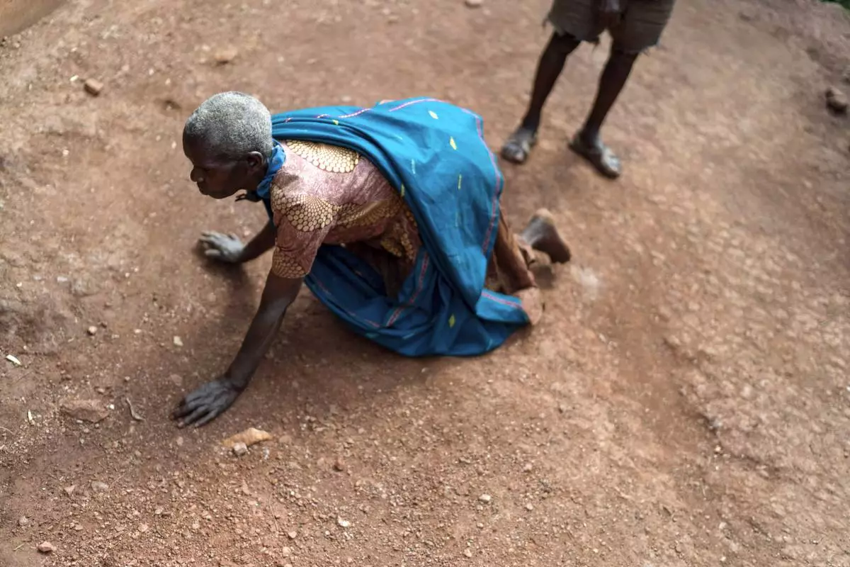 Saverina Tumukunde, 67, who struggles with mental illness, chases ants on the ground outside her home as her husband Daniel Nvunabandi, 75, right, looks on, Wednesday, Nov. 20, 2024, in Omukayaga, a rural village in western Uganda. Older people living in rural villages with dementia and mental illness, conditions so foreign to many here, have been accused of witchcraft and ostracized in their own communities. (AP Photo/David Goldman)