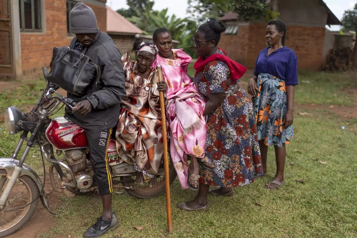 Deziranta Namisango, second from left, who has dementia, sits on a motorcycle taxi as Christine Nababi, 80, is helped onto the seat by NGO field officer, Elizabeth Nagawa, as they leave their biweekly fellowship gathering for seniors at a church in Mukono, Uganda, Thursday, Nov. 14, 2024. (AP Photo/David Goldman)