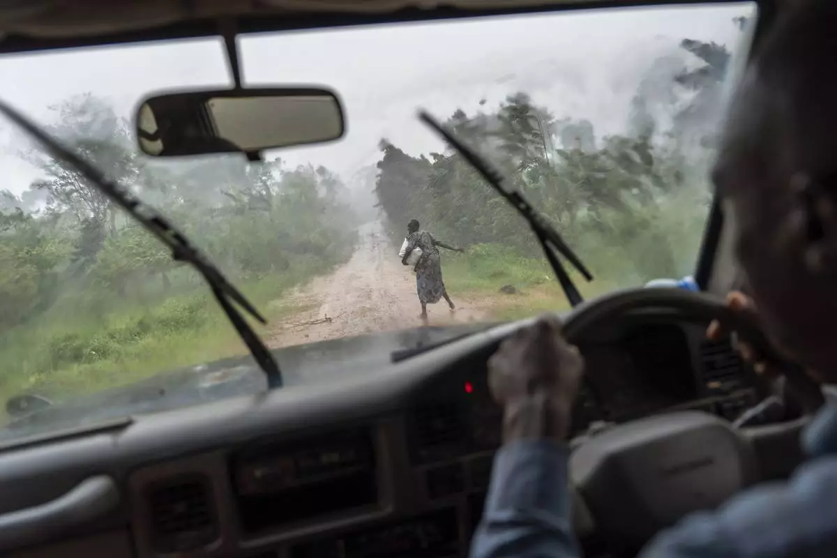 An older woman walks through her village in the middle of a downpour, Saturday, Nov. 16, 2024, in Mukono, Uganda. (AP Photo/David Goldman)