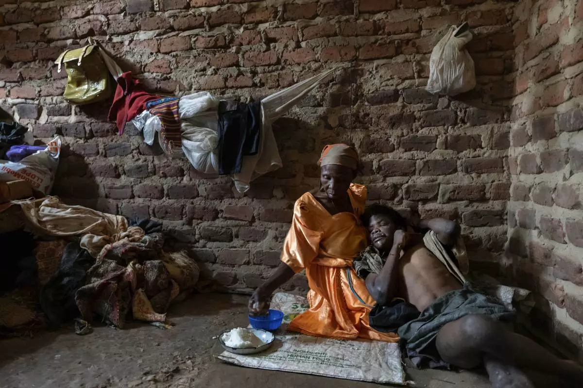 Alice Mary Nasanga, who is about 70 and was banished by members of her family after she was accused of witchery, holds her disabled son, Ibrahim Kamya, 30, as she feeds him on the floor of the home they share in Nabalanga, Uganda, Saturday, Nov. 16, 2024. "There is no one. Only God knows," she says of what will happen to him when she's physically no longer able to care for him. (AP Photo/David Goldman)