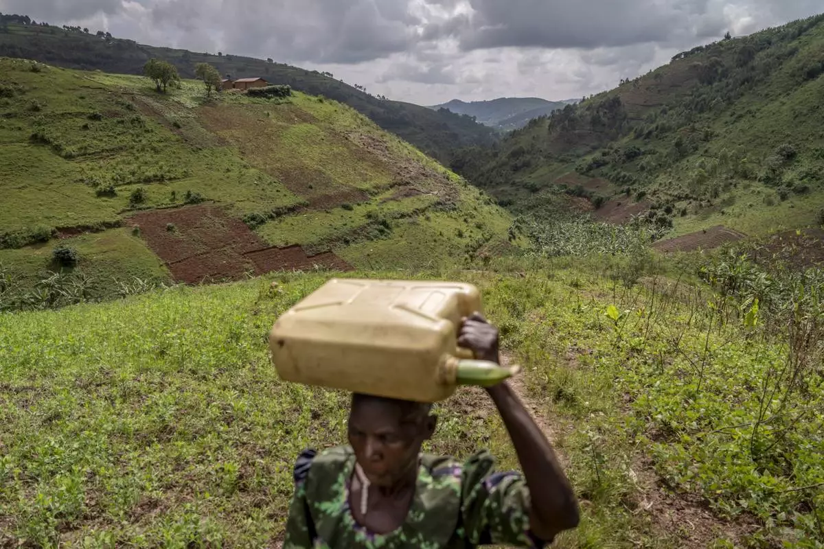 Joy Okwanjire, who is in her 70s, carries a 10-liter jug as part of her daily hike among steep hills to collect water from a valley stream nearly 500 feet below and over a kilometer away, Wednesday, Nov. 20, 2024, in Mubushuro, in western Uganda. (AP Photo/David Goldman)