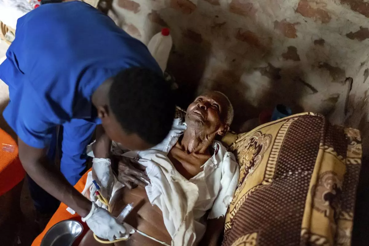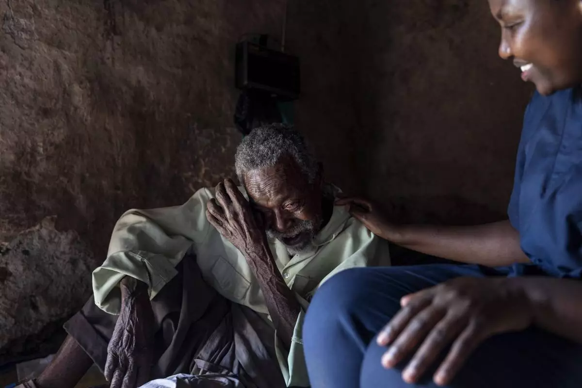 Field nurse Derrick Ssemanda, left, with Reach One Touch One Ministries, changes the catheter of Yafesi Nakyanga, 86, during a visit to his home, Saturday, Nov. 16, 2024, in Nabalanga, Uganda. (AP Photo/David Goldman)