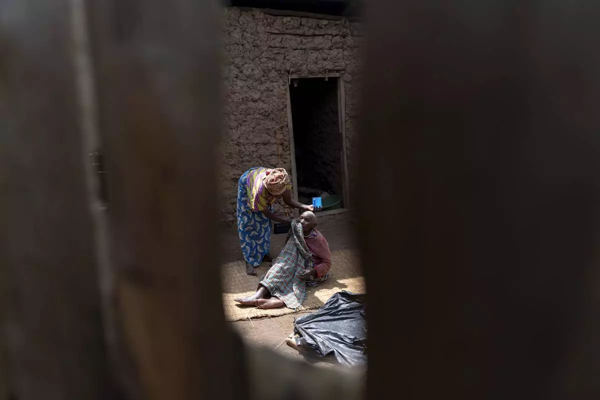 Monday Jonah, left, wipes the face of her mother, Audrine Kasharu, who has dementia, as she sits in the courtyard of their home in Kandago, a rural village in western Uganda, Monday, Nov. 18, 2024. When Jonah must leave her mother alone, she locks her up inside the house so she won't wander off and so thieves won't steal from them. (AP Photo/David Goldman)