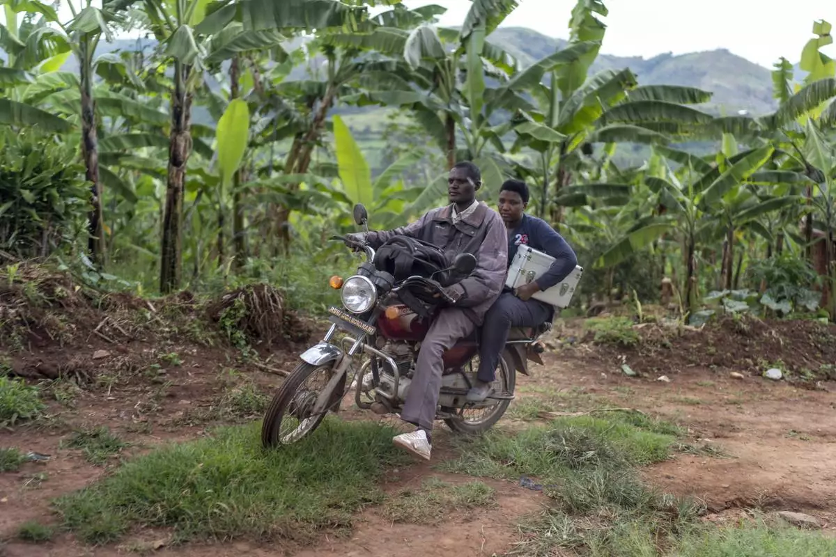 Field nurse Winnie Katwesigye, with Reach One Touch One Ministries rides on the back of a motorcycle taxi to check on older patients at their homes in rural areas where most live without running water and access to healthcare, in the Rukiga District, Uganda, Tuesday, Nov. 19, 2024. (AP Photo/David Goldman)