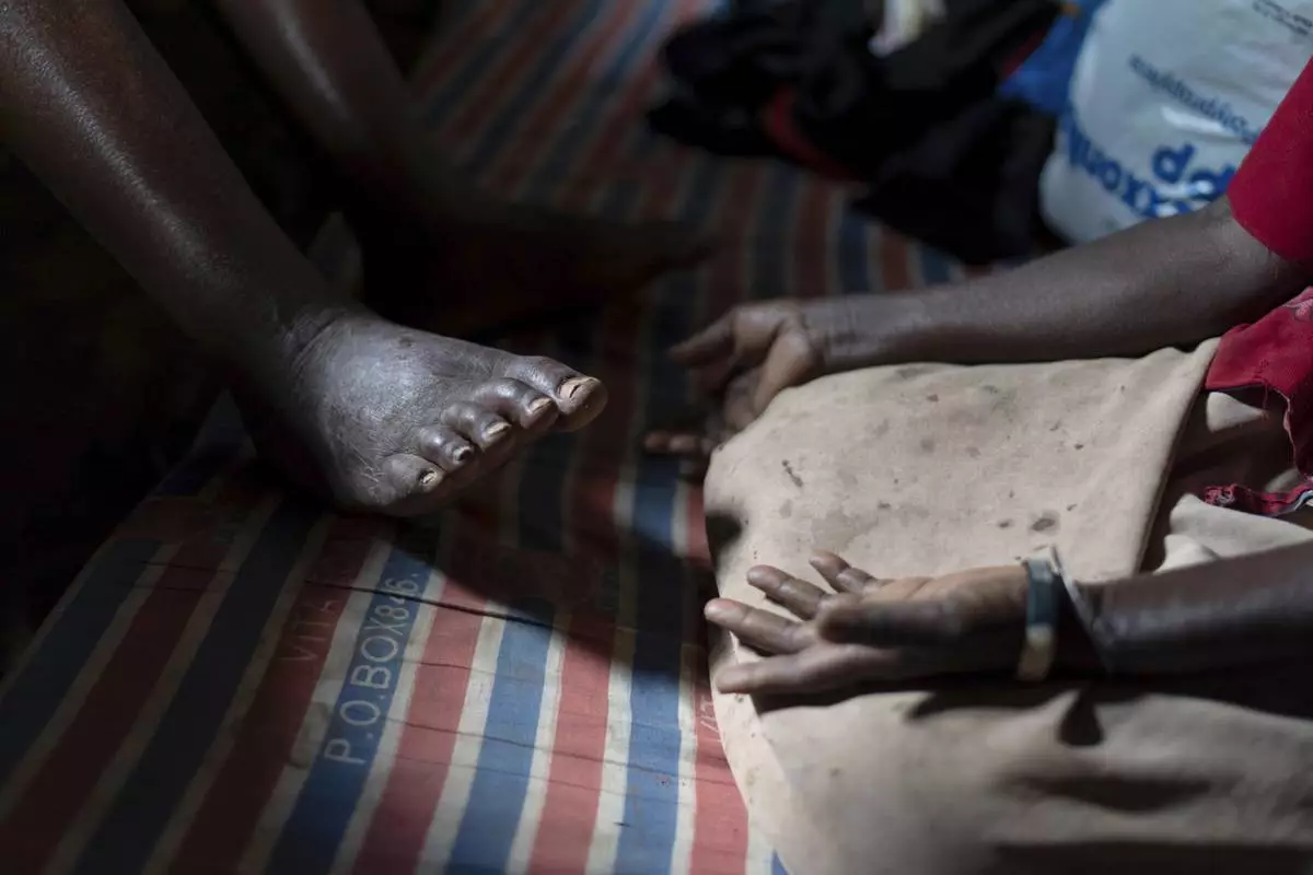 Maria Kimono, 69, right, gestures at the swollen feet of her husband, Erisafan Khayiki, 80, as he sits in pain at the edge of his bed at their home in Nabalanga, Uganda, Saturday, Nov. 16, 2024. (AP Photo/David Goldman)