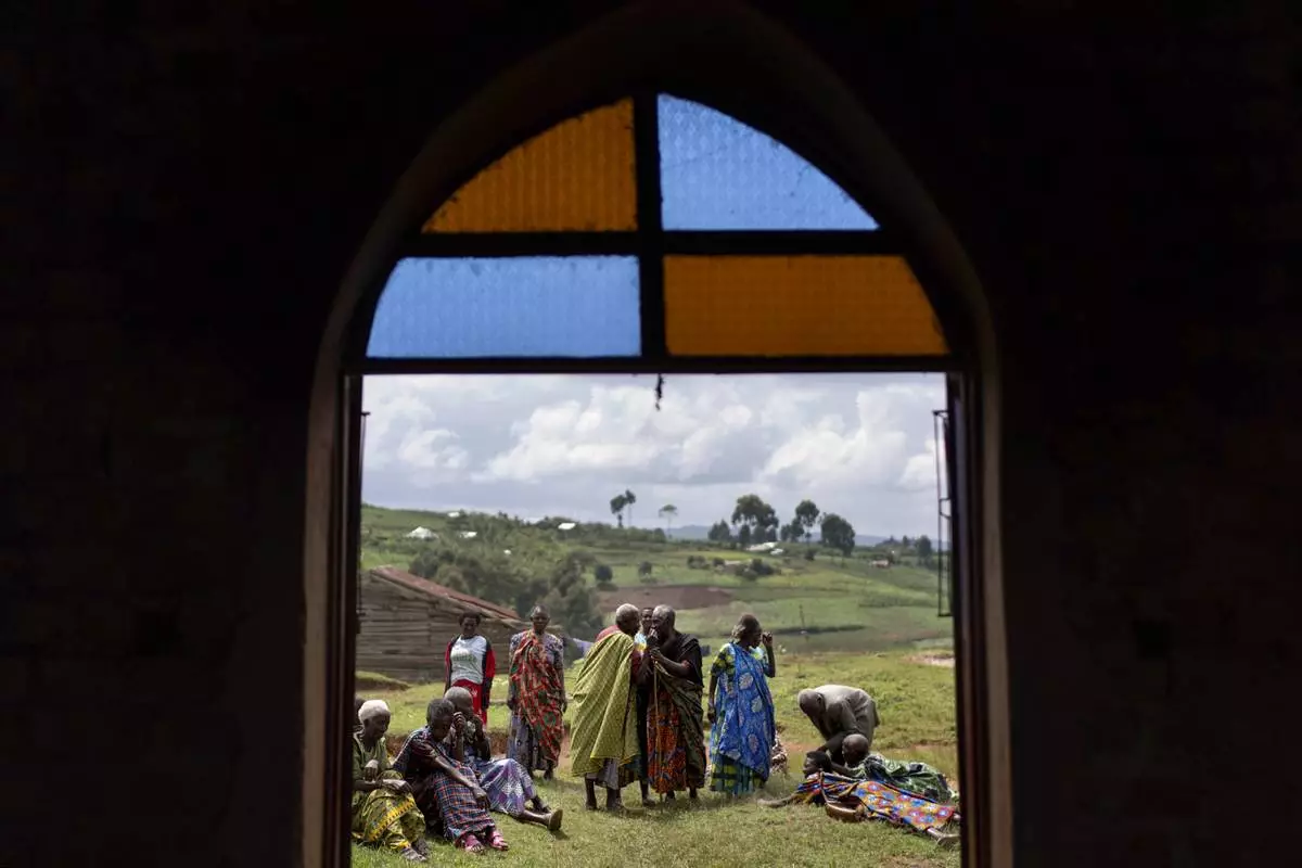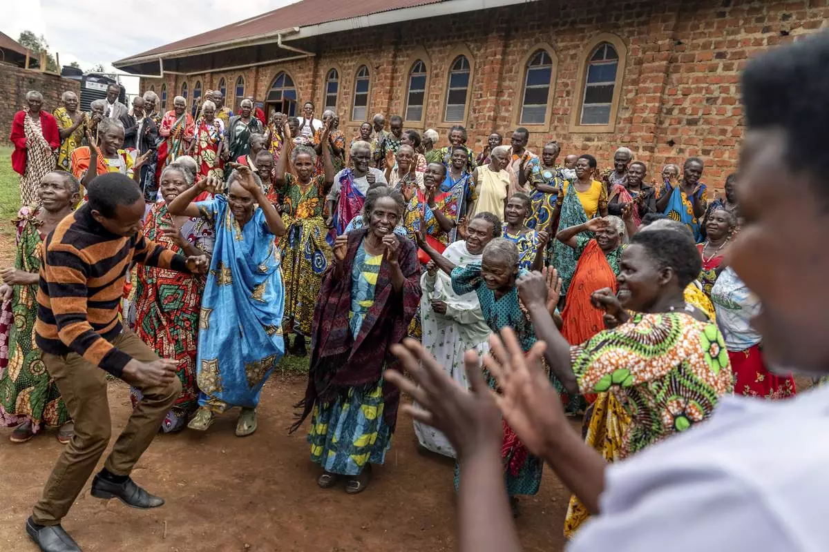 Older residents gather outside a church for their biweekly fellowship which aims to bring seniors together for companionship while providing food and health education, in Rwamucucu, a rural area in western Uganda, Wednesday, Nov. 20, 2024. (AP Photo/David Goldman)