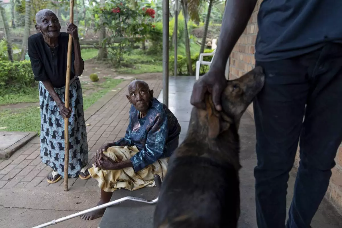 Donanta Nanyanzi, who is in her 80s, left, and Veronica Nakattee, who's unsure of her age, sit in the garden as the sole caretaker Emmanuel Bakaali, pets the resident dog at a small care home for seniors, Saturday, Nov. 16, 2024, in Mukono, Uganda. (AP Photo/David Goldman)