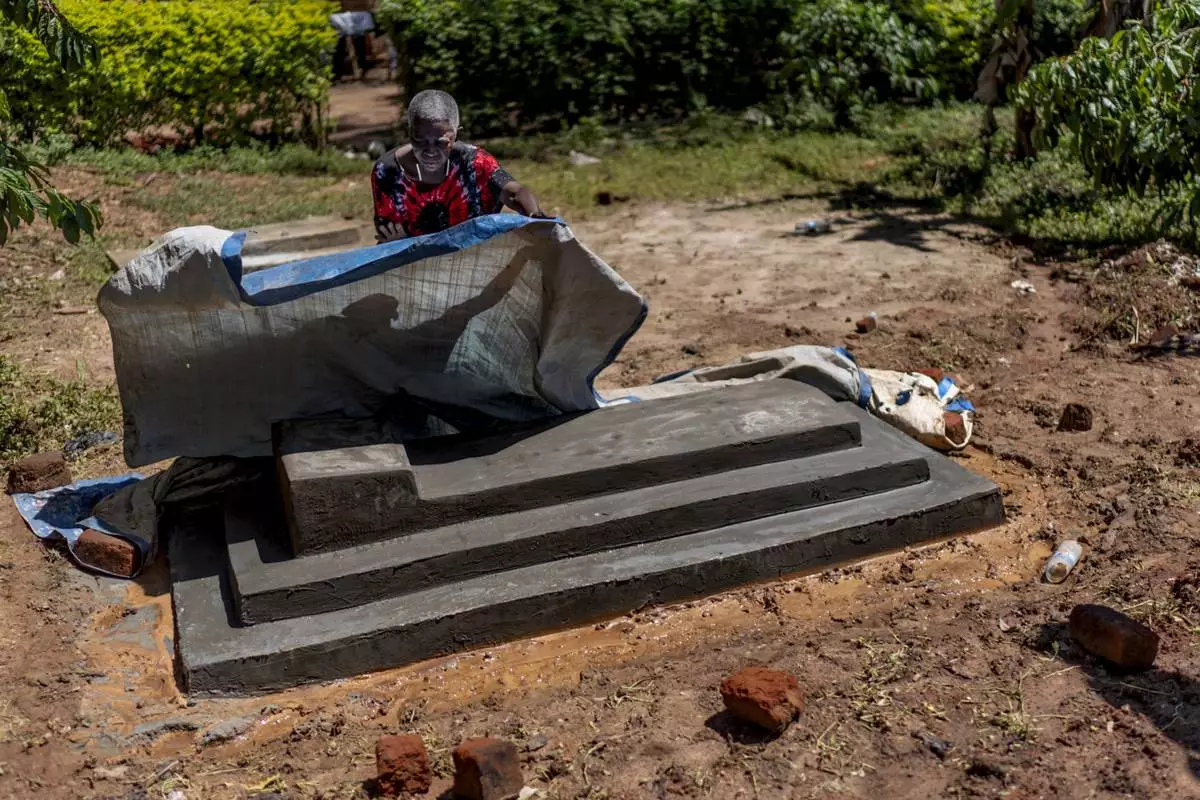 Maria Kimono, 69, places the tarp over the fresh grave of her husband, Erisafan Khayiki, who died just days before as an ailment went untreated, outside their home in Nabalanga, Uganda, Friday, Nov. 22, 2024. (AP Photo/David Goldman)