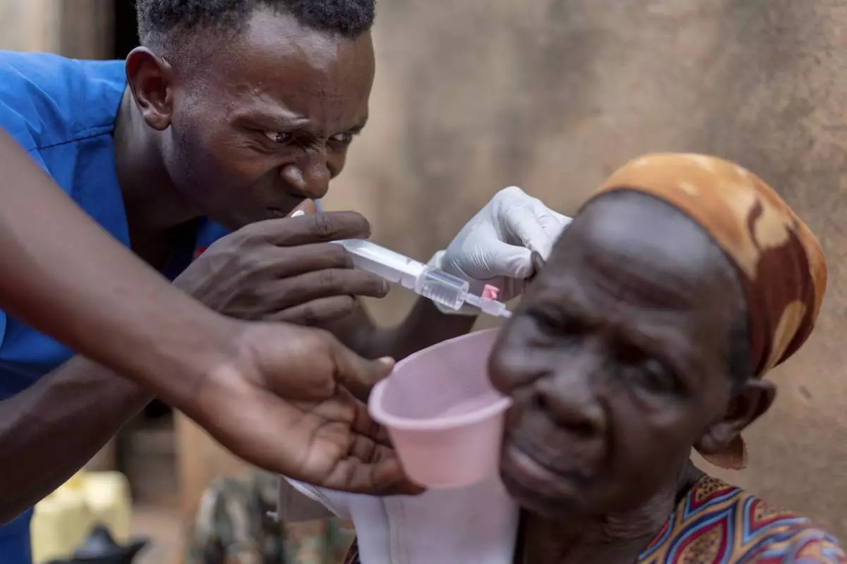 Field nurse Derrick Ssemanda washes out the ear of Tolofisa Nalugwa, who is about 90, as part of a visit by the NGO Reach One Touch One Ministries in Magogo, Uganda, Saturday, Nov. 16, 2024. (AP Photo/David Goldman)