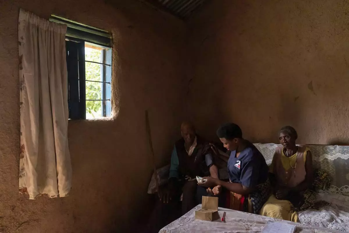 Field nurse Winnie Katwesigye with Reach One Touch One Ministries checks the blood pressure of Ernest Rwarangire, 70, left, as his wife, Priscilla Tigeita, 68, waits her turn in their home in Omurutare, a rural village in western Uganda, Tuesday, Nov. 19, 2024. (AP Photo/David Goldman)