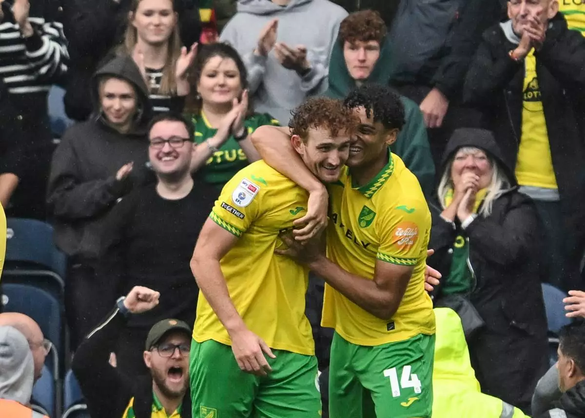 Norwich City's Josh Sargent, left, celebrates with Ben Chrisene after scoring his sides second goal during a Sky Bet Championship soccer match against Blackburn Rovers, Saturday, Aug. 30, 2025, at Ewood Park in Blackburn, England (Cody Froggatt/PA via AP)