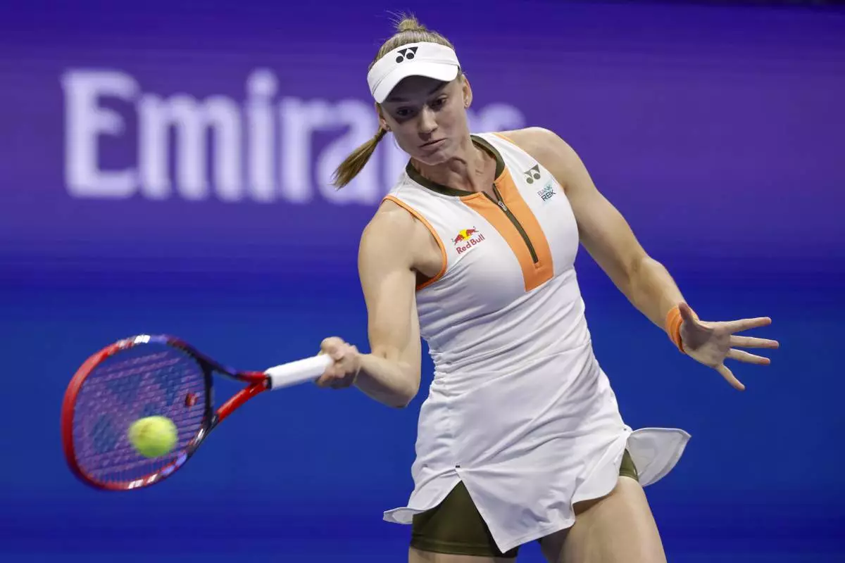 Elena Rybakina, of Kazakhstan, returns a shot to Marketa Vondrousova, of the Czech Republic, during the fourth round of the US Open tennis championships, Sunday, Aug. 31, 2025, in New York. (AP Photo/Adam Hunger)