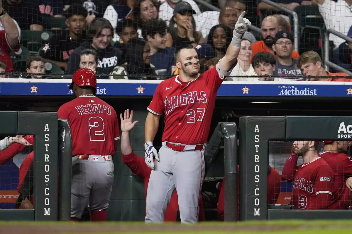 Los Angeles Angels designated hitter Mike Trout (27) celebrates after Logan O'Hoppe and Luis Rengifo scored off of a single by Oswald Peraza during the ninth inning of a baseball game against the Houston Astros in Houston, Saturday, Aug. 30, 2025. (AP Photo/Ashley Landis)
