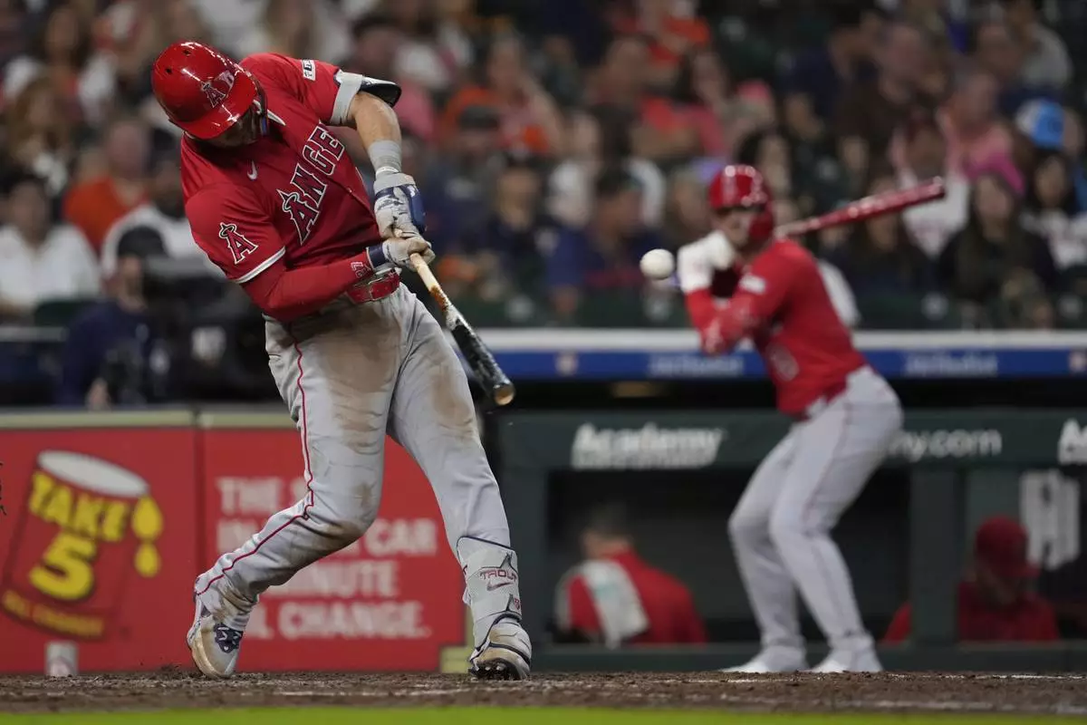 Los Angeles Angels designated hitter Mike Trout, left, doubles during the eighth inning of a baseball game against the Houston Astros in Houston, Sunday, Aug. 31, 2025. (AP Photo/Ashley Landis)