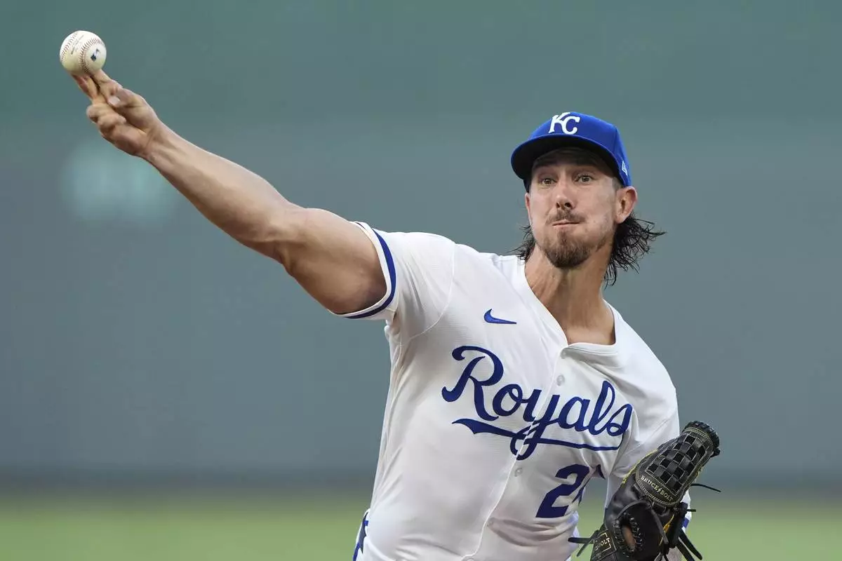 Kansas City Royals starting pitcher Michael Lorenzen throws during the first inning of a baseball game against the Los Angeles Angels, Tuesday, Sept. 2, 2025, in Kansas City, Mo. (AP Photo/Charlie Riedel)