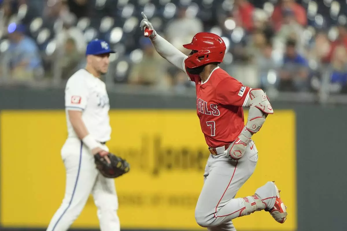 Los Angeles Angels' Jo Adell (7) runs the bases after hitting a solo home run during the sixth inning of a baseball game Tuesday, Sept. 2, 2025, in Kansas City, Mo. (AP Photo/Charlie Riedel)