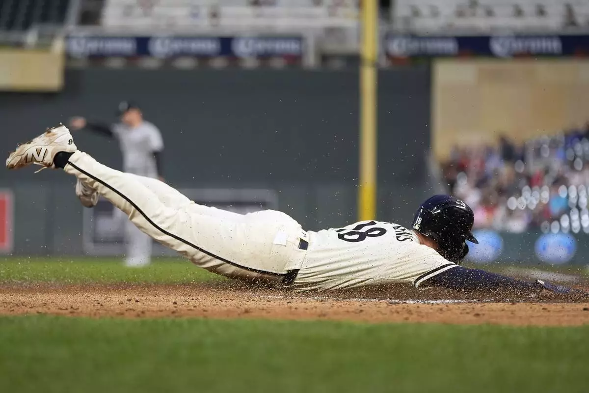 Minnesota Twins' Kody Clemens dives to score a run during the fourth inning of a baseball game against the Chicago White Sox Tuesday, Sept. 2, 2025, in Minneapolis. (AP Photo/Abbie Parr)