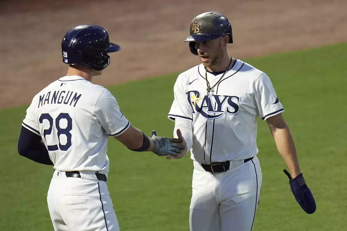 Tampa Bay Rays' Brandon Lowe celebrates with Jake Mangum (28) after owe scored on a fieldeer's choice by Josh Lowe off Seattle Mariners pitcher Bryan Woo during the first inning of a baseball game Tuesday, Sept. 2, 2025, in Tampa, Fla. (AP Photo/Chris O'Meara)