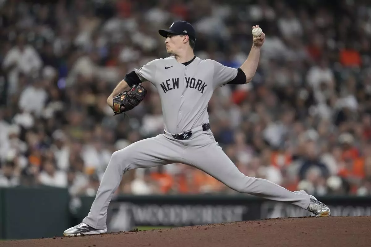 New York Yankees starting pitcher Max Fried throws during the first inning of a baseball game against the Houston Astros in Houston, Tuesday, Sept. 2, 2025. (AP Photo/Ashley Landis)