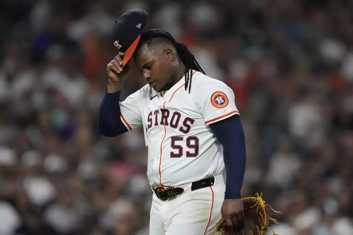 Houston Astros starting pitcher Framber Valdez leaves the mound after the top of the fifth inning of a baseball game against the New York Yankees in Houston, Tuesday, Sept. 2, 2025. (AP Photo/Ashley Landis)