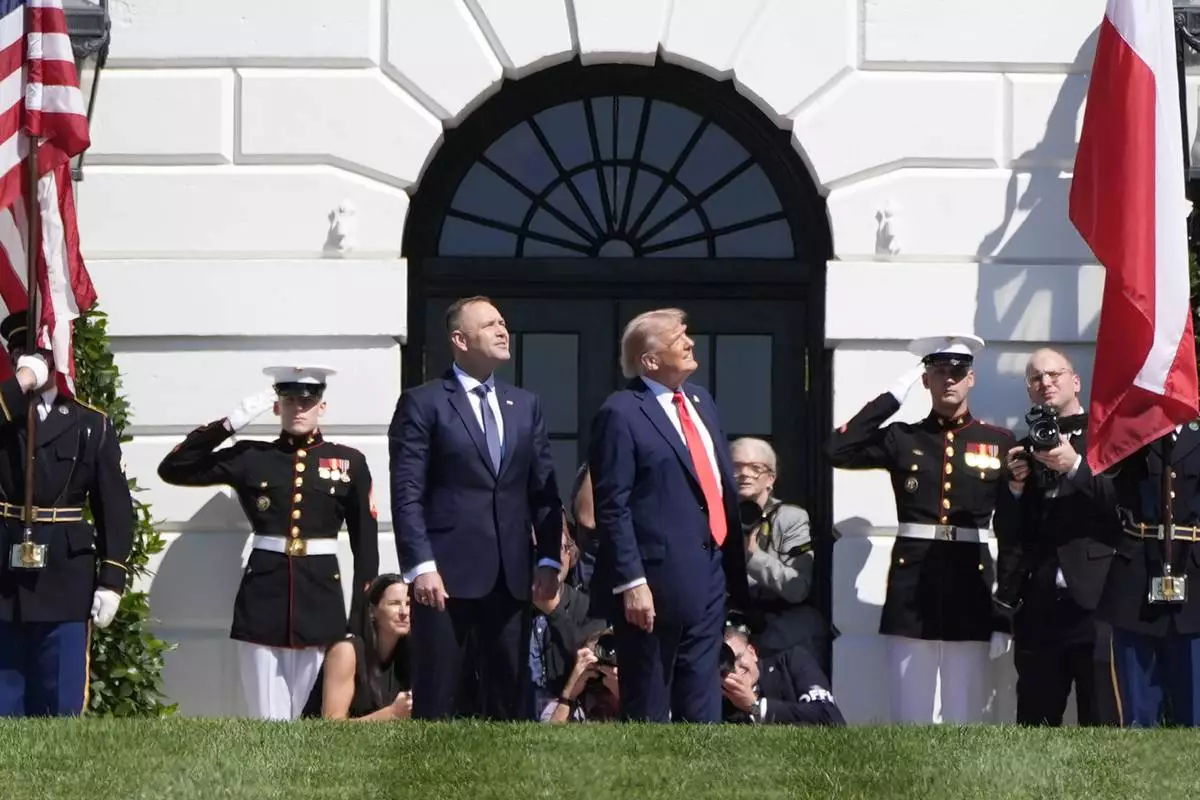 When Nawrocki arrived at the White House, Trump gave him a hearty slap on the shoulder and stood with him as they watched U.S. military jets soaring over the South Lawn.