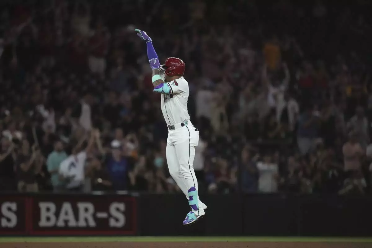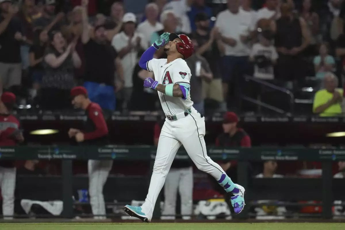 Arizona Diamondbacks' Ketel Marte celebrates his three-run home run against the Texas Rangers during the seventh inning of a baseball game Tuesday, Sept. 2, 2025, in Phoenix. (AP Photo/Ross D. Franklin)