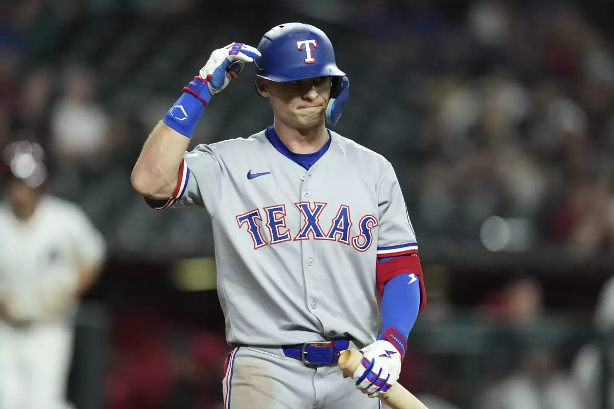Texas Rangers' Michael Helman walks back to the dugout after being called out on strikes against the Arizona Diamondbacks during the ninth inning of a baseball game Tuesday, Sept. 2, 2025, in Phoenix. (AP Photo/Ross D. Franklin)