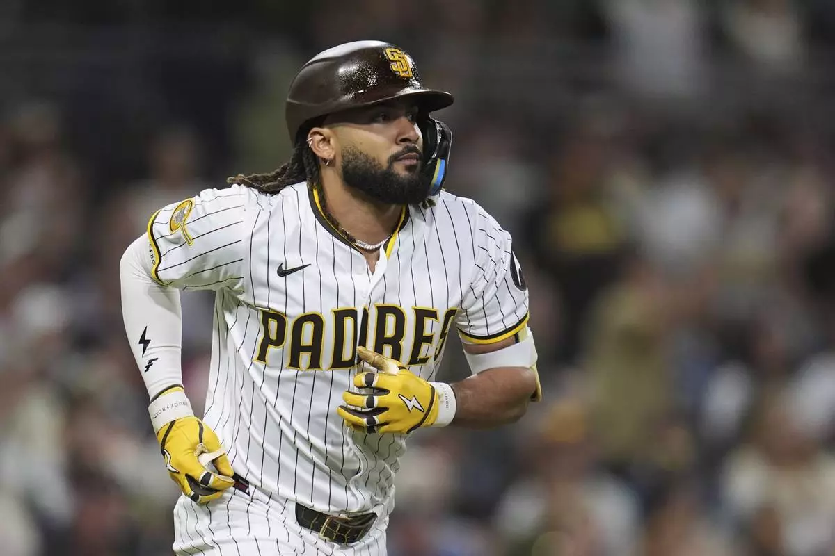 San Diego Padres' Fernando Tatis Jr. watches his flyout during the fifth inning of a baseball game against the Baltimore Orioles Tuesday, Sept. 2, 2025, in San Diego. (AP Photo/Gregory Bull)