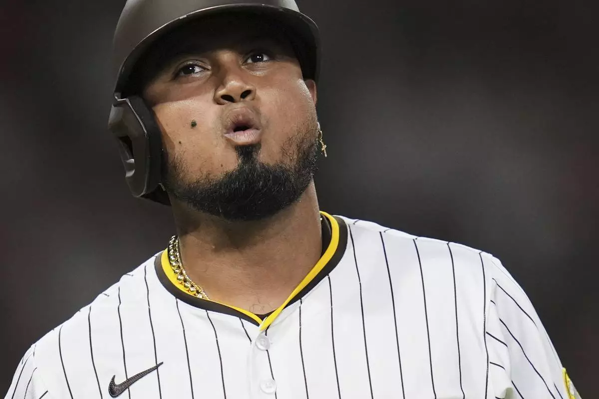 San Diego Padres' Luis Arraez exhales as he watches a ball go foul while batting during the fifth inning of a baseball game against the Baltimore Orioles Tuesday, Sept. 2, 2025, in San Diego. (AP Photo/Gregory Bull)