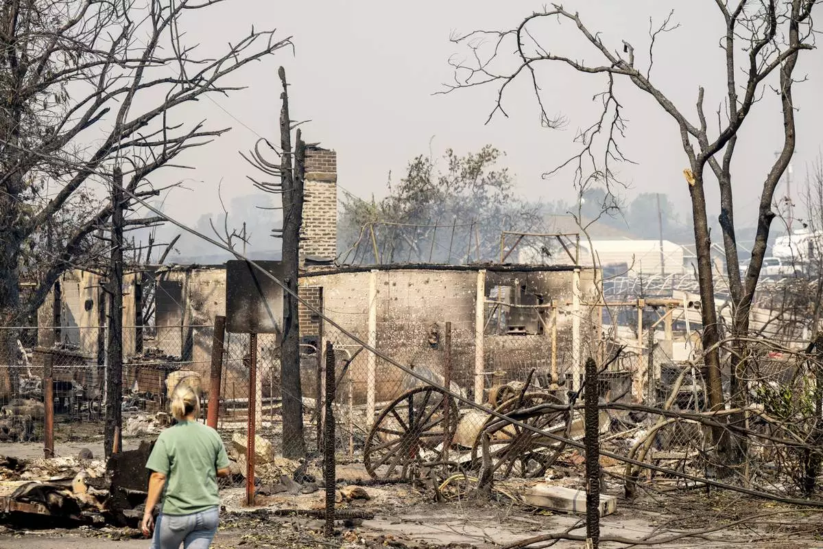 A resident passes a home destroyed by the TCU September Lightning Complex fire in the Chinese Camp community of Tuolumne County, Calif., on Wednesday, Sept. 3, 2025. (AP Photo/Noah Berger)