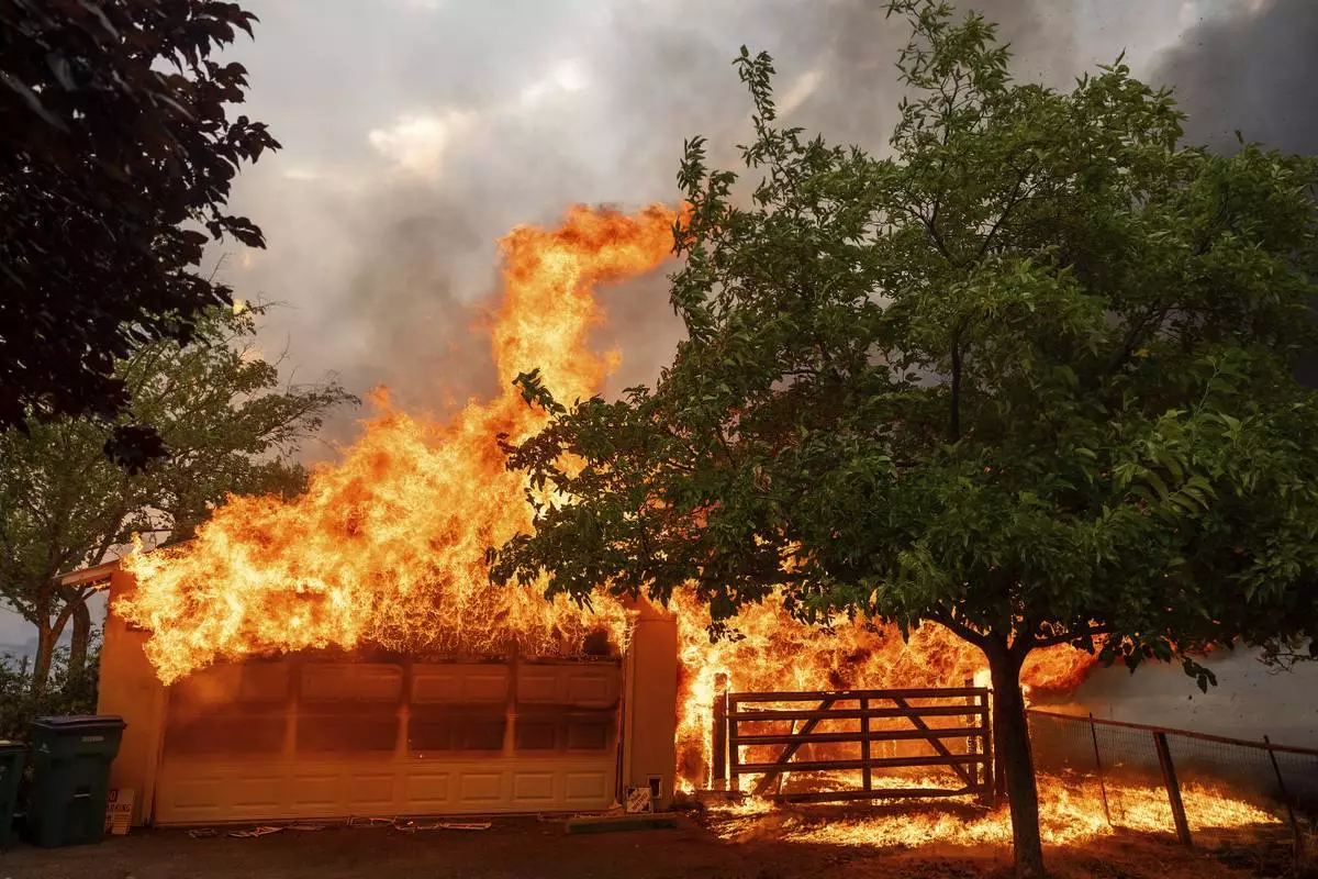 Flames consume a garage as the 6-5 Fire burns through the Chinese Camp community of Tuolumne County, Calif., on Tuesday, Sept. 2, 2025. (AP Photo/Noah Berger)
