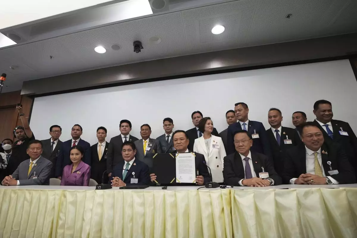 Leader of Bhumjai Thai Party Anutin Charnvirakul, fourth left in front, shows the signed Memorandum of Understanding between his coalition parties and the People's party at Parliament in Bangkok, Thailand, Wednesday, Sept. 3, 2025. (AP Photo/Sakchai Lalit)
