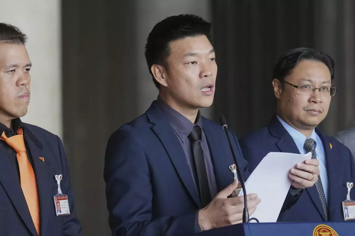 Leader of People's Party, Natthaphong Ruengpanyawut, center, talks to reporters during a press conference at Parliament in Bangkok, Thailand, Wednesday, Sept. 3, 2025. (AP Photo/Sakchai Lalit)