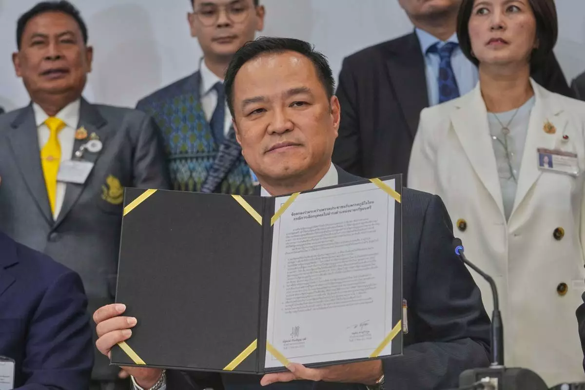 Leader of Bhumjai Thai Party Anutin Charnvirakul shows the signed Memorandum of Understanding between his coalition parties and the People's party at Parliament in Bangkok, Thailand, Wednesday, Sept. 3, 2025. (AP Photo/Sakchai Lalit)