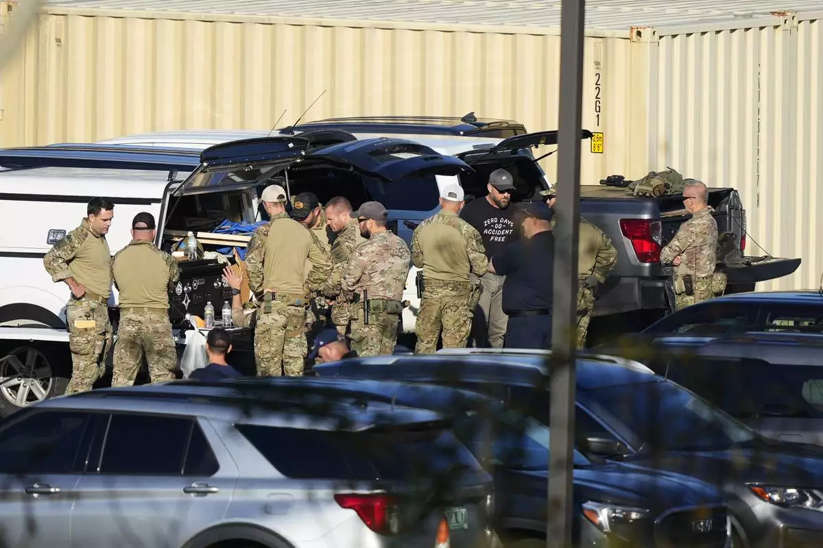 FILE - Law enforcement officers are staged in a school parking lot as a manhunt continues in the aftermath of a mass shooting in Lewiston, Maine, Oct. 27, 2023. (AP Photo/Matt Rourke, file)