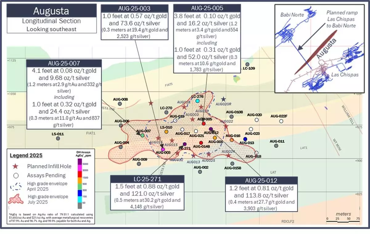 The Augusta vein, a significant new discovery in the Gap Zone, has been defined over 1,050 feet (320 meters) along strike and 492 feet (150 meters) down dip, with the main vein averaging 2.3 feet (0.7 meters) in thickness (as shown in Figure 2). Grades of up to 0.81 oz/t gold (27.7 g/t) and 113.8 oz/t silver (3,903 g/t) have been drilled in the main Augusta vein. Augusta remains open in multiple directions and has been traced progressively closer to the new underground decline at Las Chispas, from which further drilling is now underway. The vein shows strong potential to thicken in the southeastward direction as it converges with the projected extension of the William Tell Mini and William Tell veins.