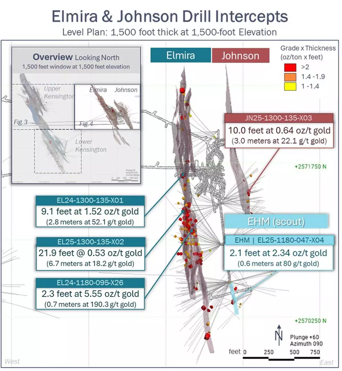 Drilling at Elmira has confirmed continuity across the upper portions of both the Main and South Zones across a substantial strike length of 2,400 feet (732 meters). A total of 106 significant intercepts from 60 holes were returned, of which over 30% exceed 1.0 ounce per ton (28.3 g/t) gold, with an average true thickness of 1.7 feet (0.5 meters). New Elmira ramp development has allowed access to infill drilling of the up-dip portion of the Elmira resource to the north and provided access for follow-up drilling at Johnson. A new scout target, EHM, was also discovered, with 11 significant intercepts over 11 holes. Notable true width intercepts from Elmira include: